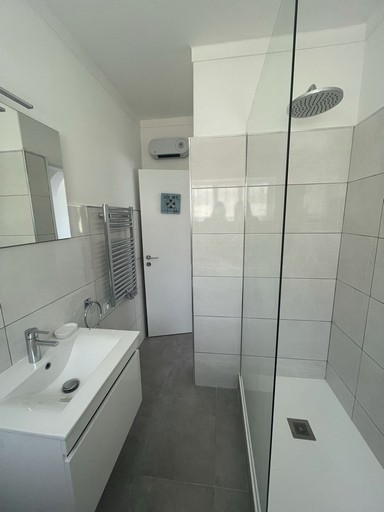 There is a new bathroom which includes a walk-in shower, toilet, sink, heated towel rail and heater.