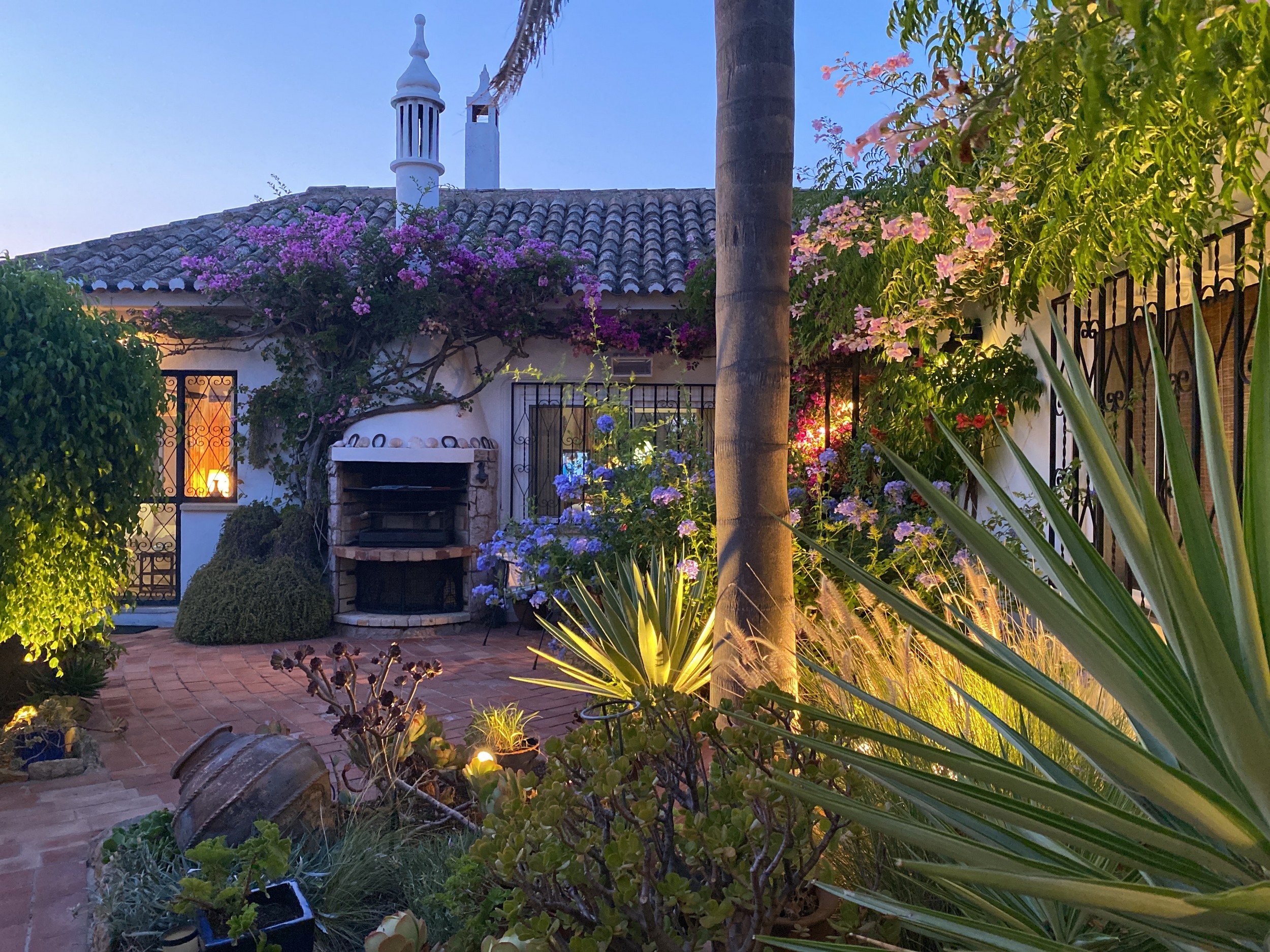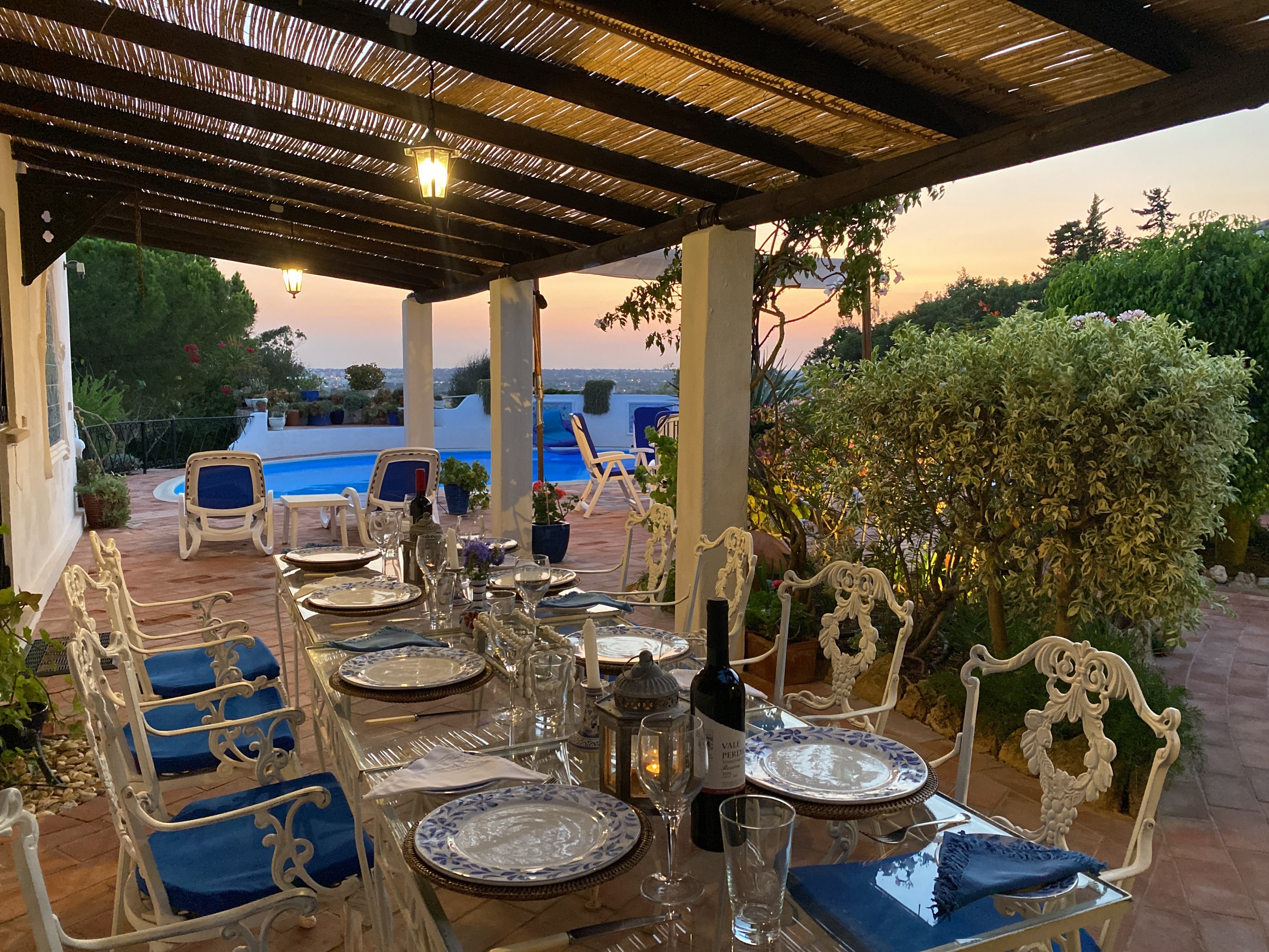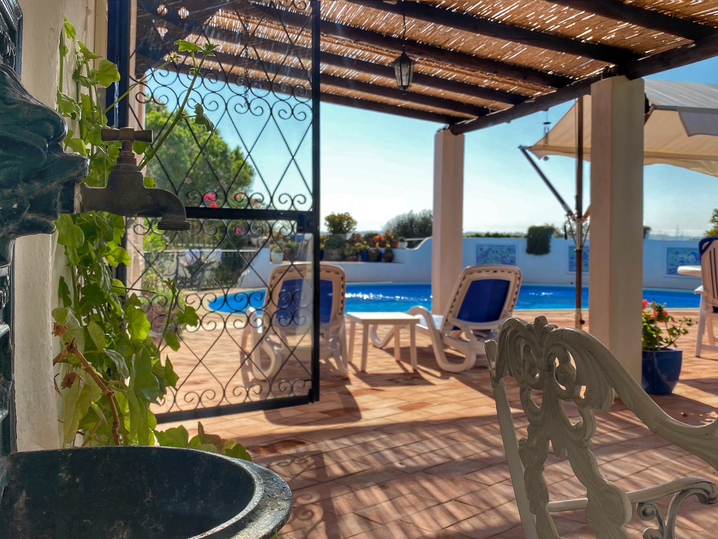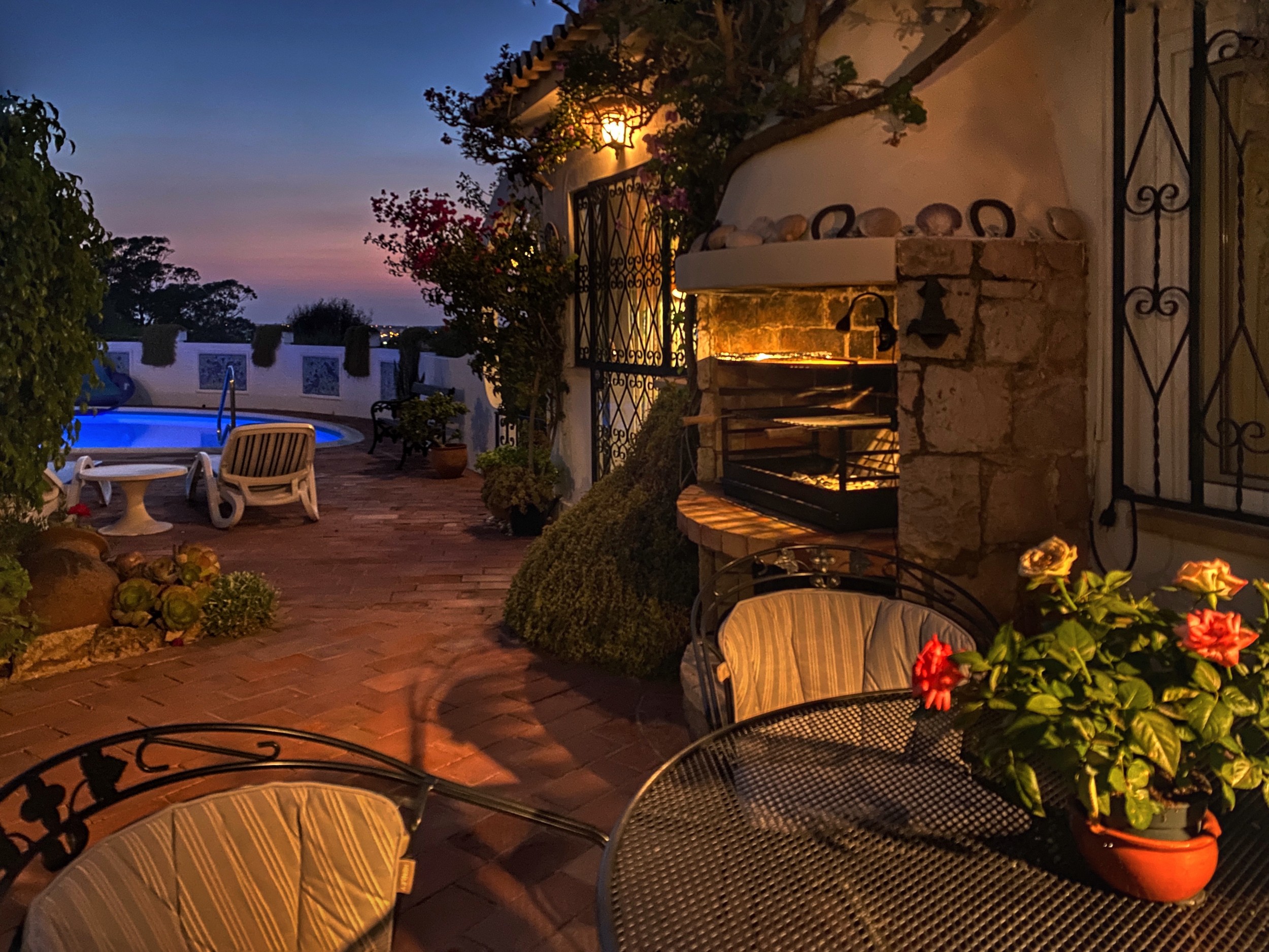 The Villa Colina is situated six miles west of Albufeira close to the famous village of Guia where you may sample the delicious chicken piri-piri from one of its many typical Algarvean restaurants. The villa is approached through the ‘Pineapple Palm’ entrance leading to the well-known Quinta da Saudade estate. It must be pointed out that this is open to the public but persons using Casa da Colina are not eligible to use the communal swimming pools unless invited. On the other hand, the tennis court is available at any time. The Restaurant, open six days a week during the summer months and serves a good variety of food. Weekly barbecues are held on a Saturday night in the summer, which are great fun for the family – persons using Casa da Colina Villa will be most welcome but booking is essential.