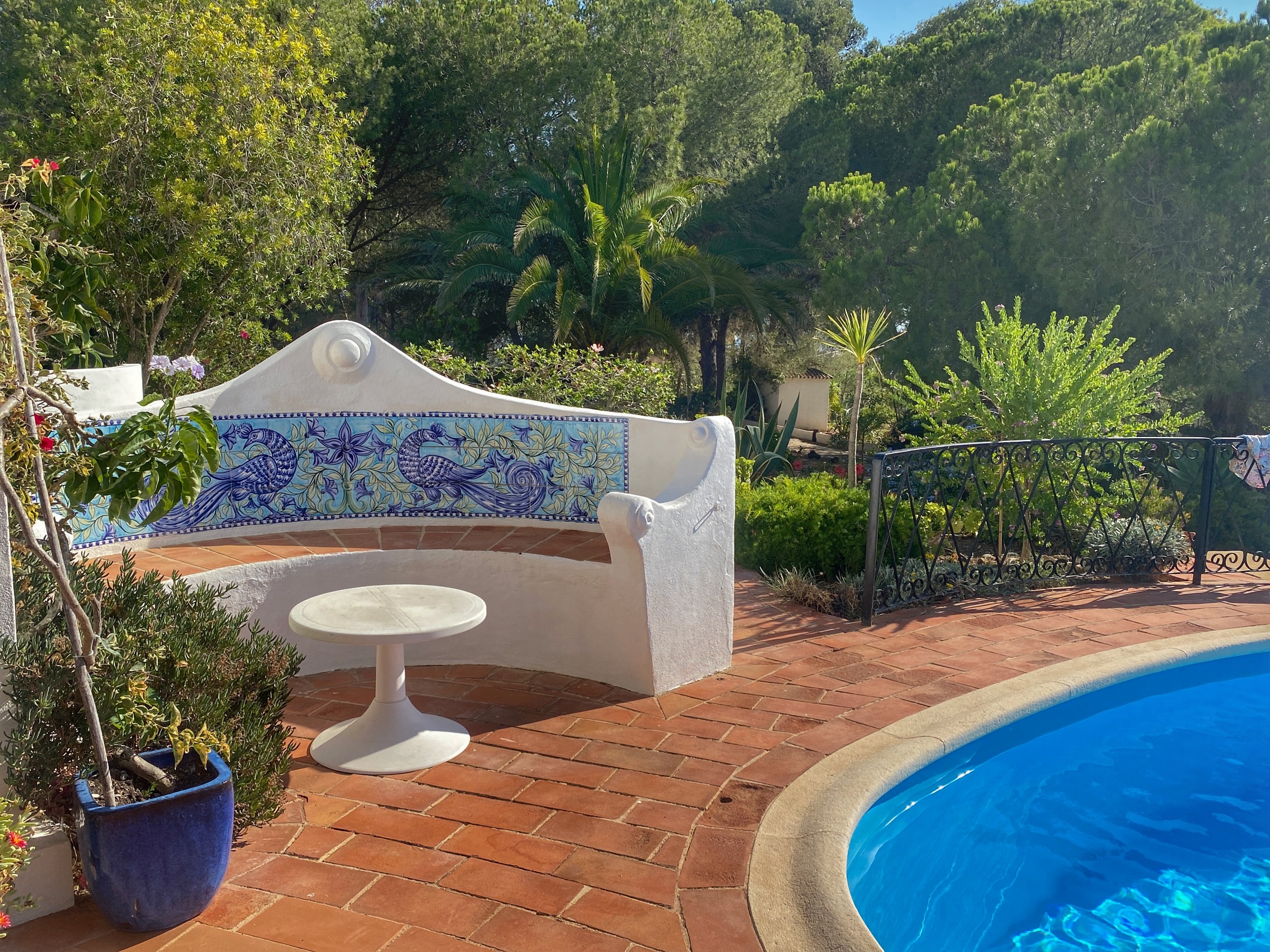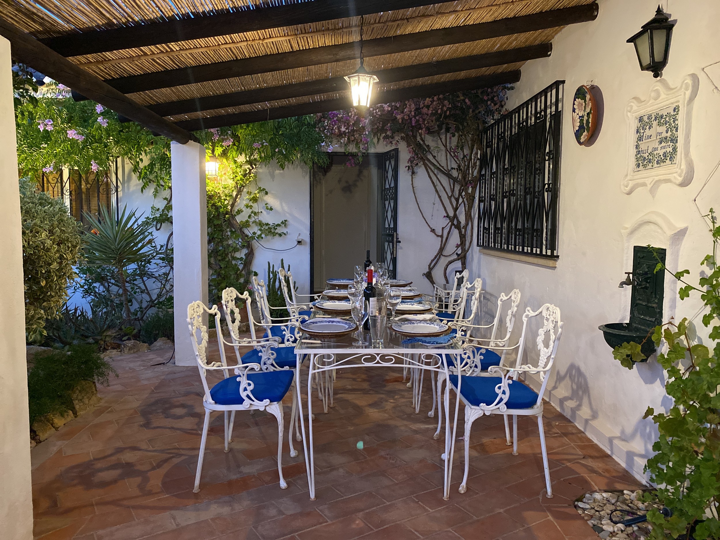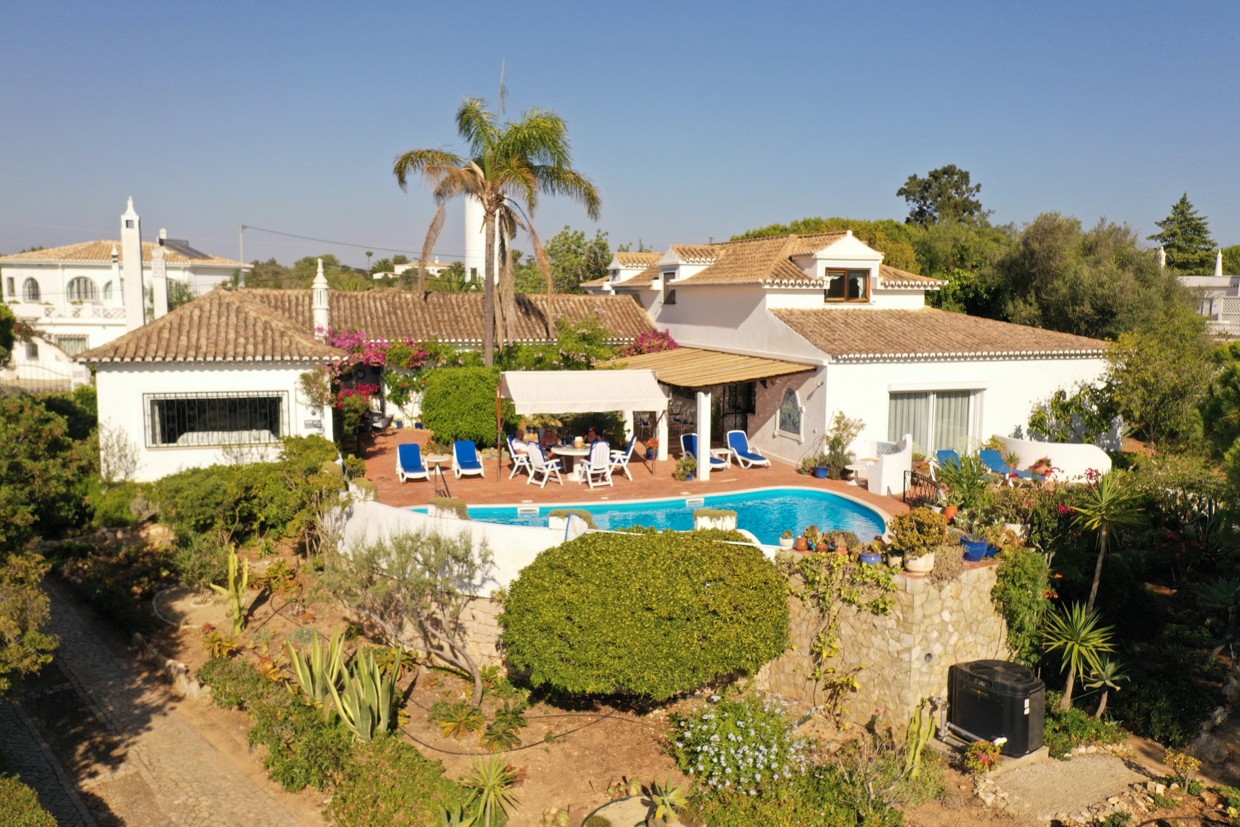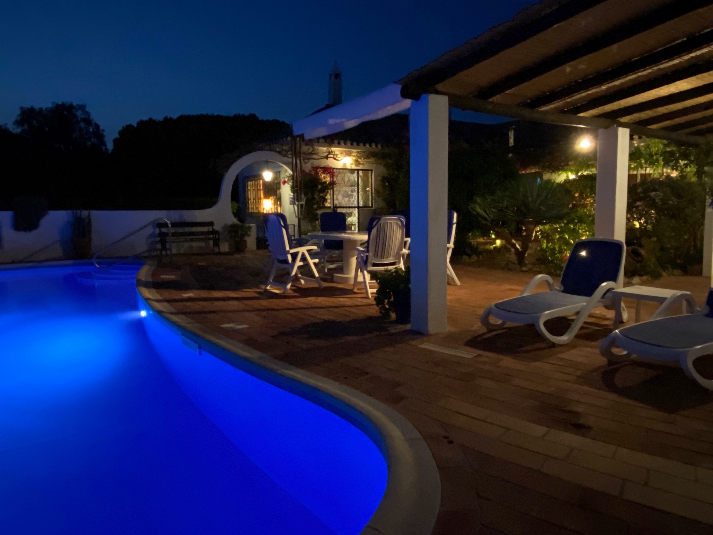 The Villa Colina is situated six miles west of Albufeira close to the famous village of Guia where you may sample the delicious chicken piri-piri from one of its many typical Algarvean restaurants. The villa is approached through the ‘Pineapple Palm’ entrance leading to the well-known Quinta da Saudade estate. It must be pointed out that this is open to the public but persons using Casa da Colina are not eligible to use the communal swimming pools unless invited. On the other hand, the tennis court is available at any time. The Restaurant, open six days a week during the summer months and serves a good variety of food. Weekly barbecues are held on a Saturday night in the summer, which are great fun for the family – persons using Casa da Colina Villa will be most welcome but booking is essential.