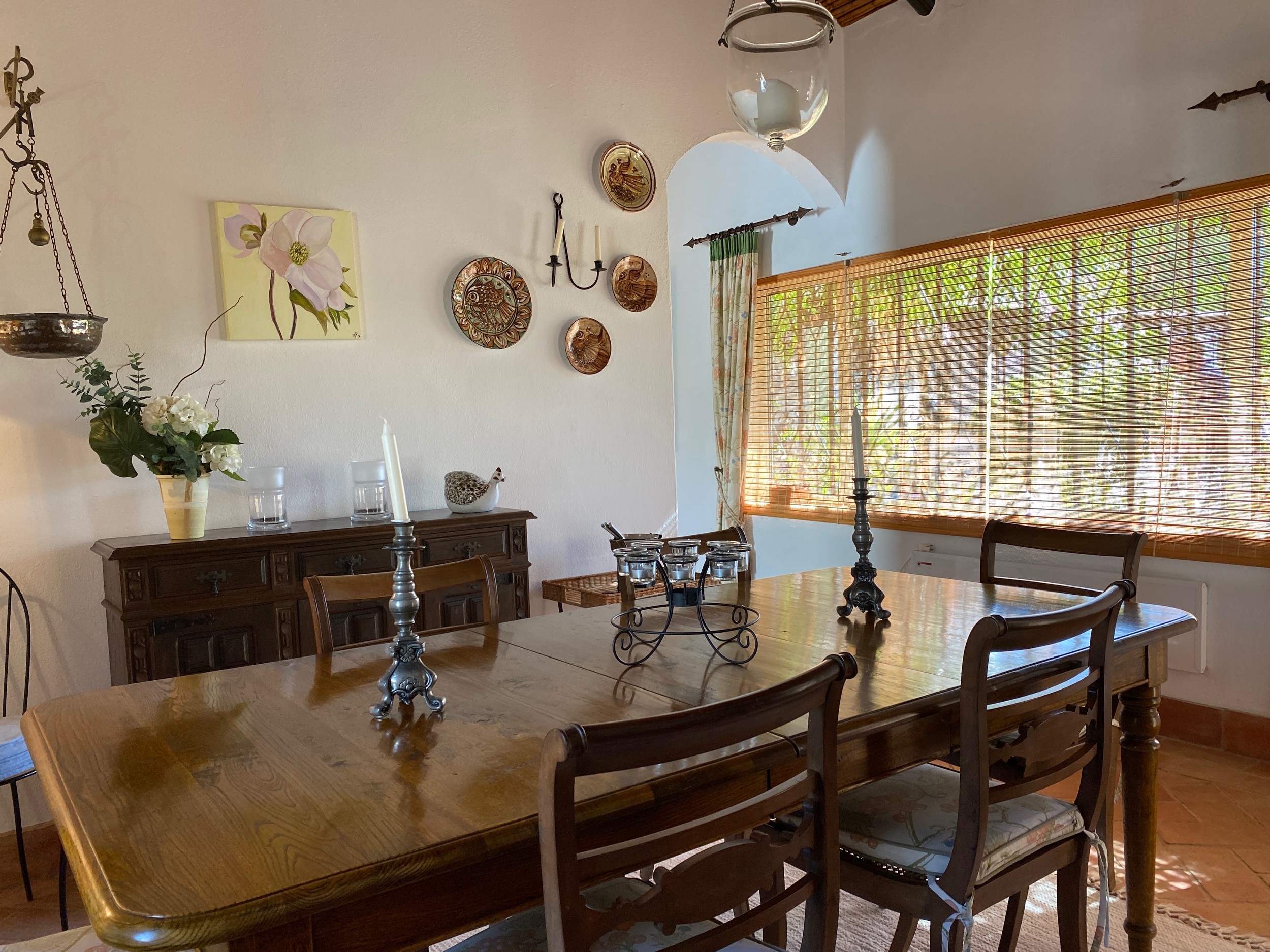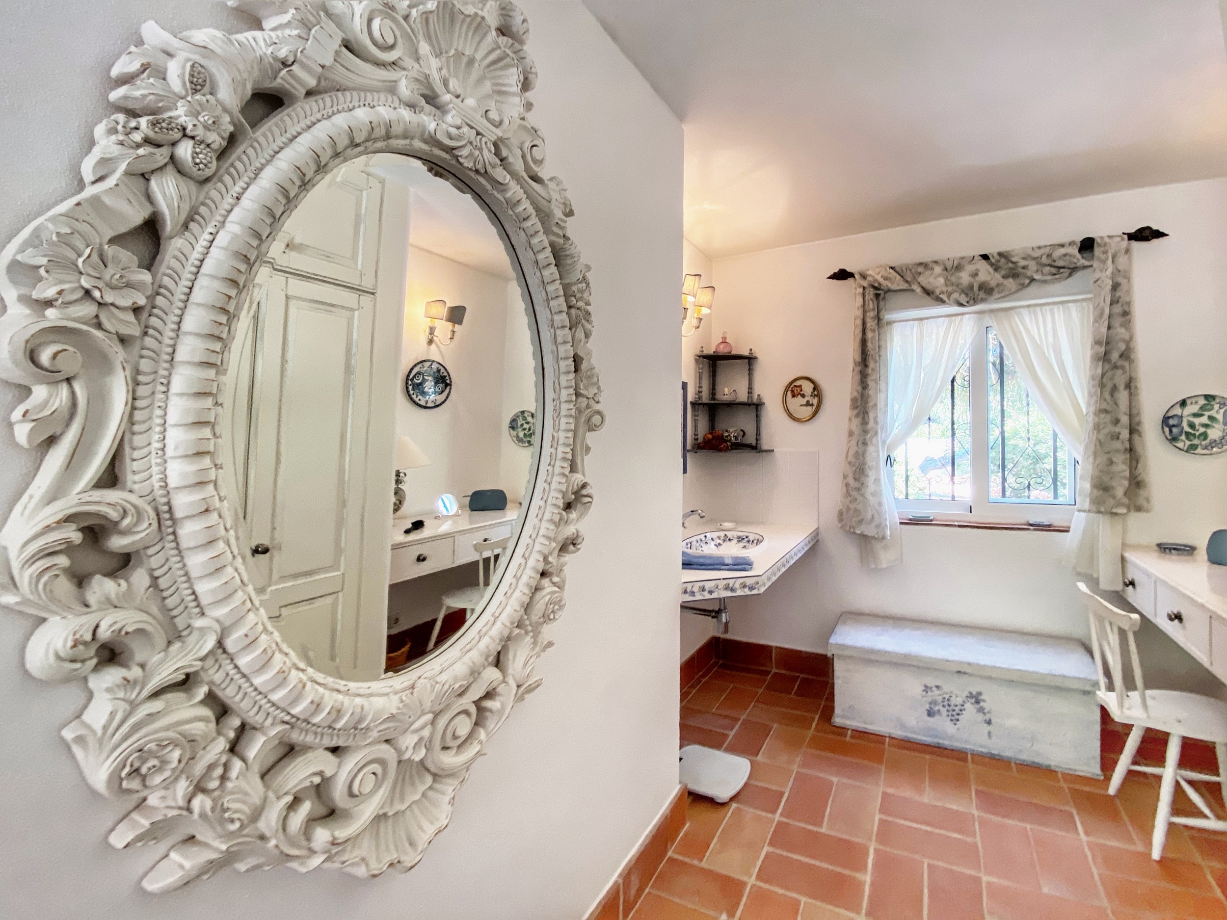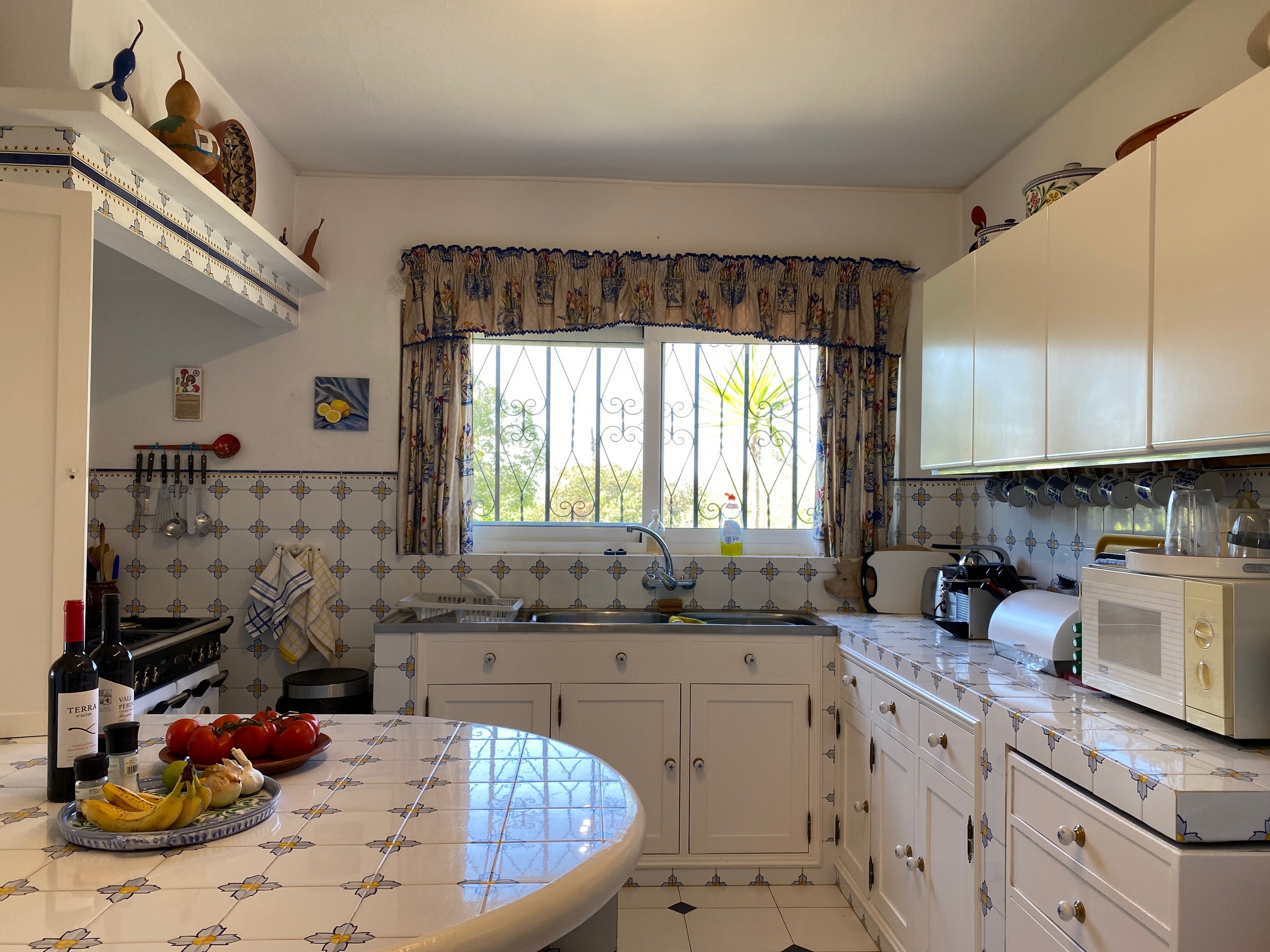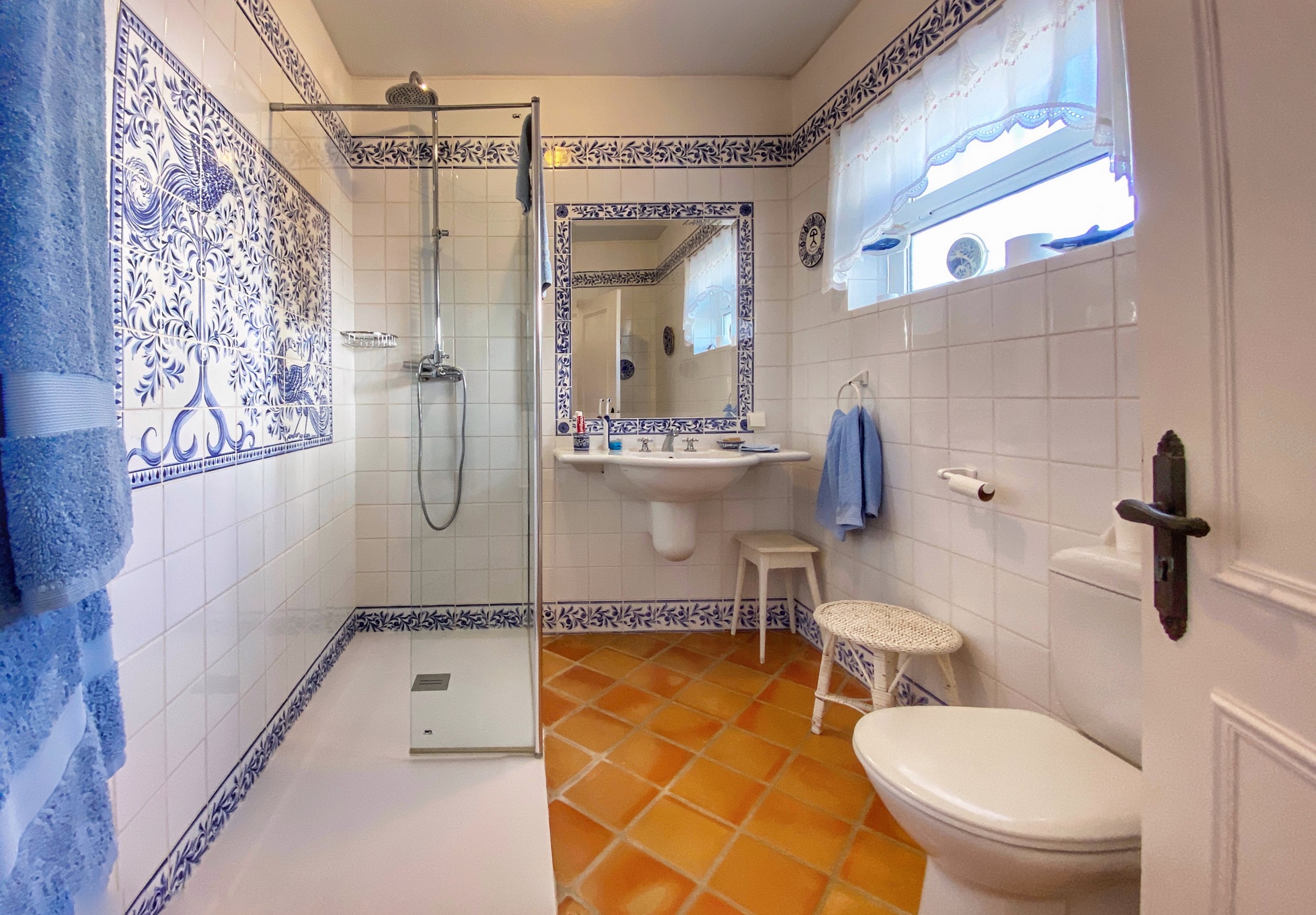 The master bedroom, with its king-sized bed, enjoys spectacular views. It has its own dressing room and bathroom en suite. There are two further bedrooms downstairs. The pink bedroom has two twin beds with recently refurbished en suite bathroom . The blue bedroom is smaller and can have two small single beds for children or can be made up as a double bed as required – this room uses the third downstairs attractively tiled blue shower room. There is a further cloakroom. All bedrooms have the advantage of air conditioning.