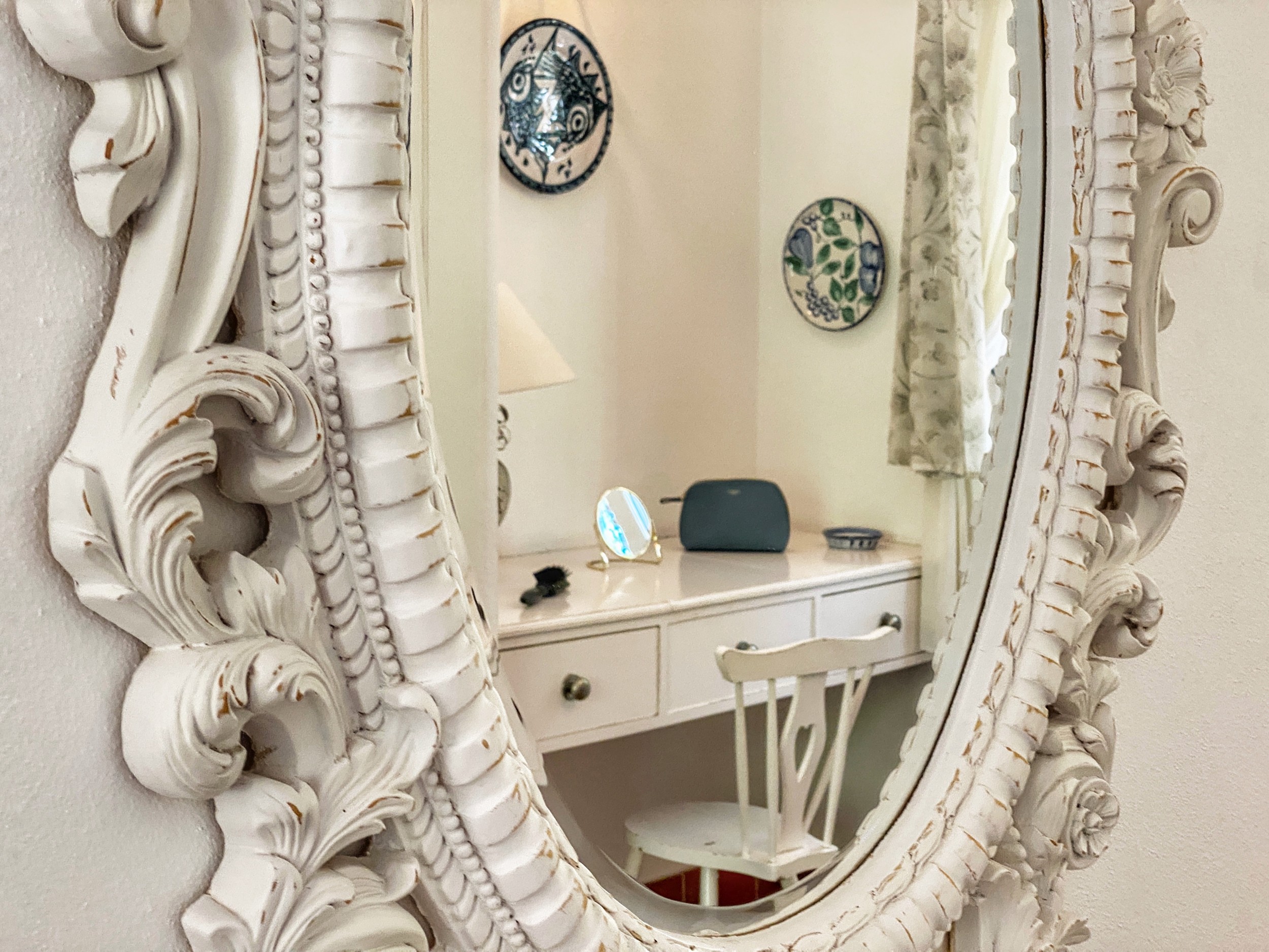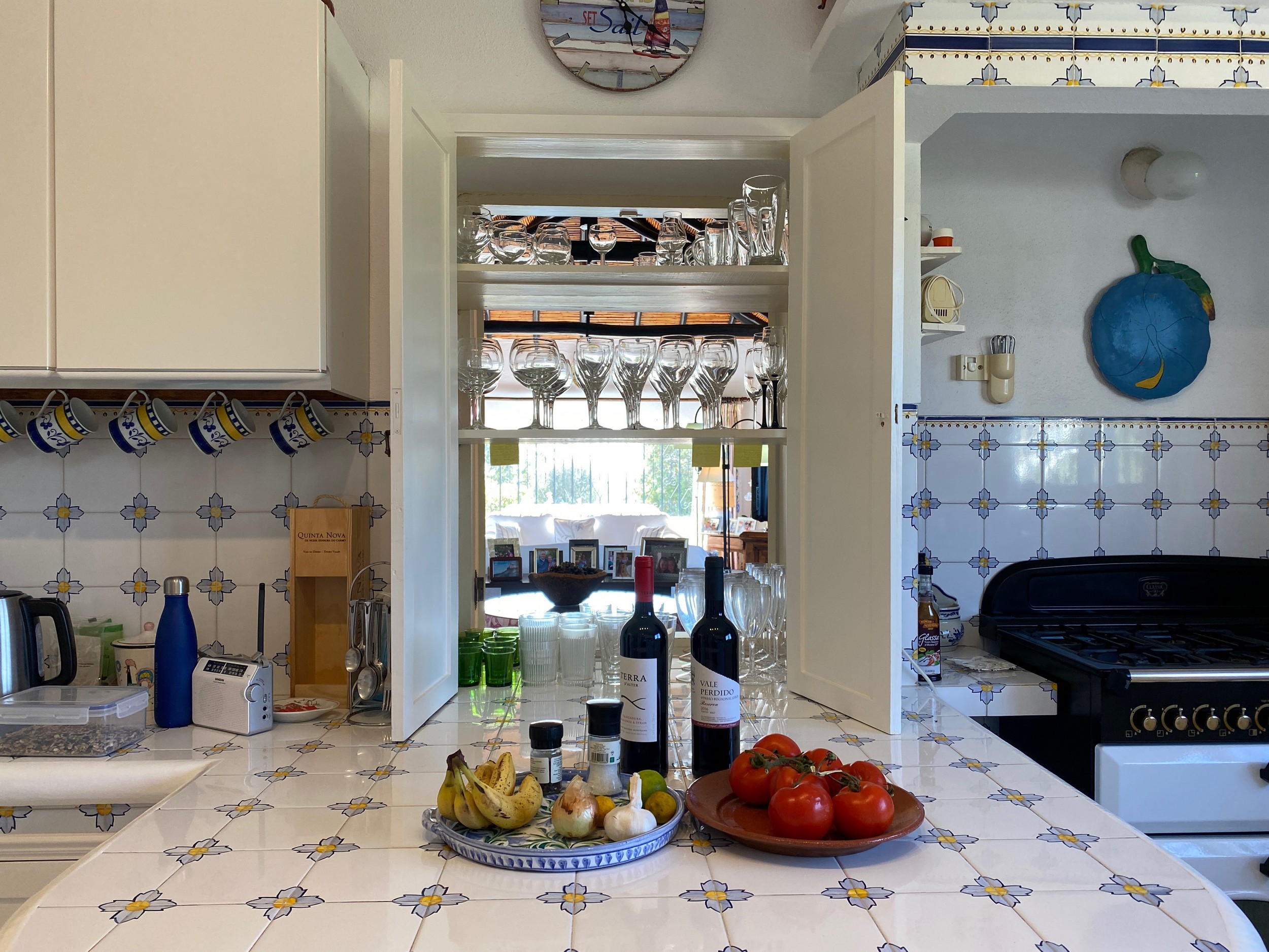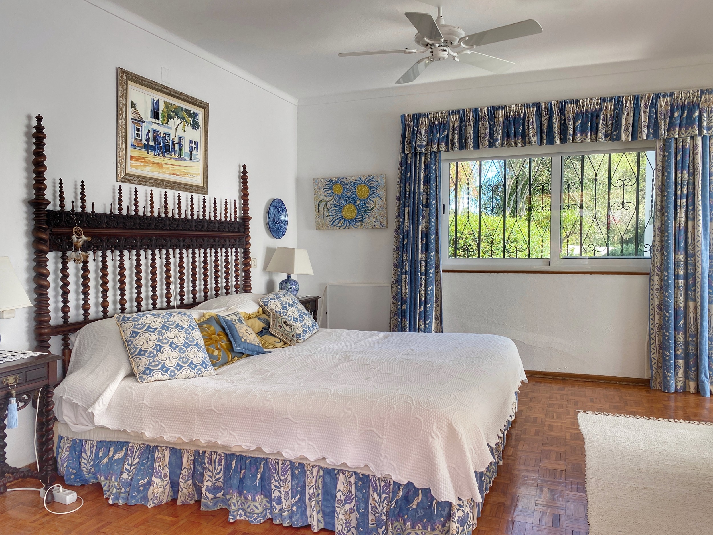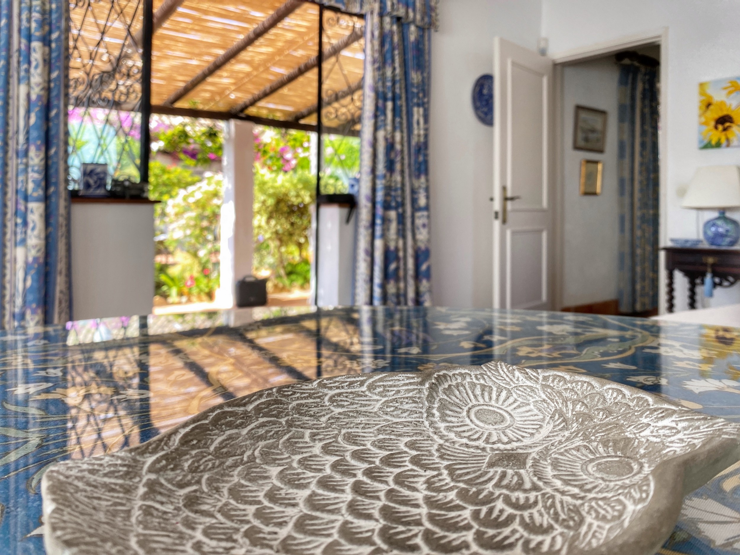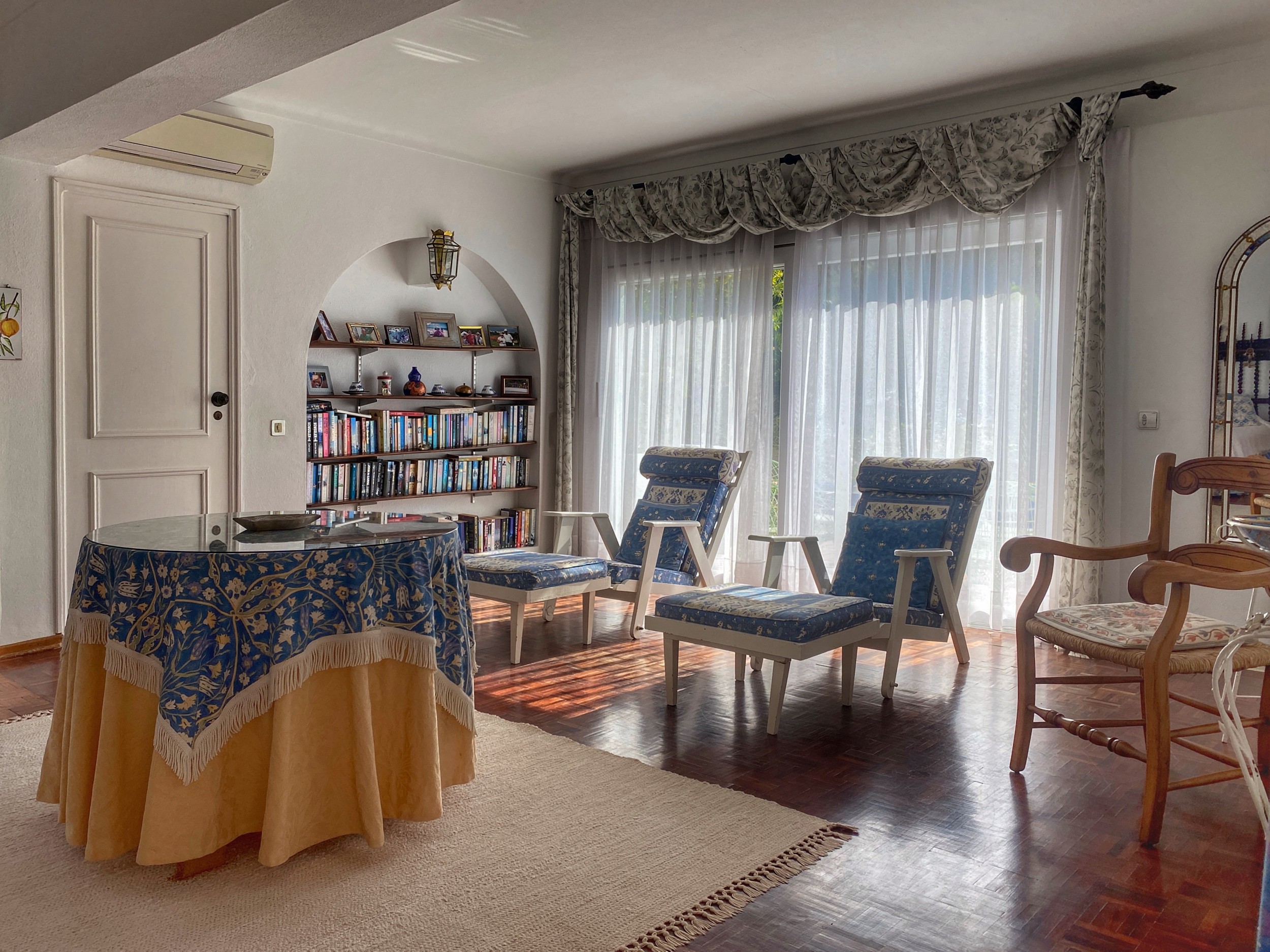The master bedroom, with its king-sized bed, enjoys spectacular views. It has its own dressing room and bathroom en suite. There are two further bedrooms downstairs. The pink bedroom has two twin beds with recently refurbished en suite bathroom . The blue bedroom is smaller and can have two small single beds for children or can be made up as a double bed as required – this room uses the third downstairs attractively tiled blue shower room. There is a further cloakroom. All bedrooms have the advantage of air conditioning.