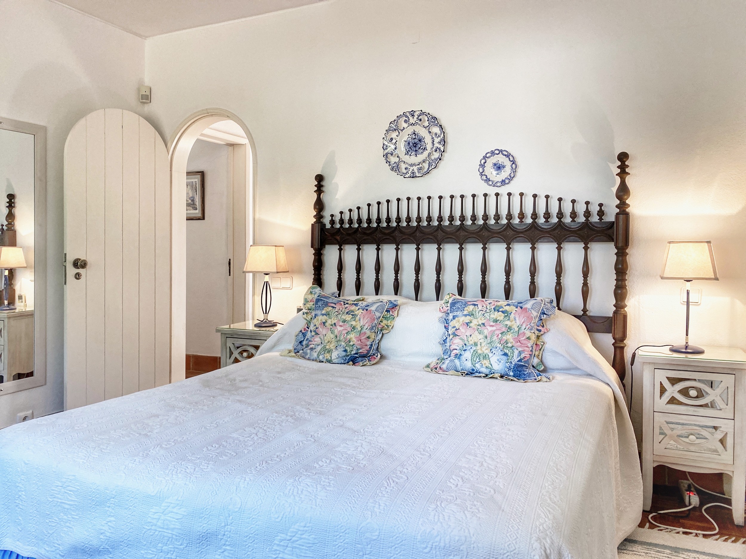 The accommodation consists of a beautiful sitting room having an unusual beamed ceiling and an Algarve style stone fireplace together with a wood-burning stove. The colourful soft furnishings reflect the courtyard garden outside. There is a small separate dining room comfortably seating six or eight people. The kitchen shows off the hand-painted Algarve tiles and consists of a large double gas cooker, microwave and large fridge. An outer kitchen houses a dishwasher, washing machine and a small fridge for cooling bottles.