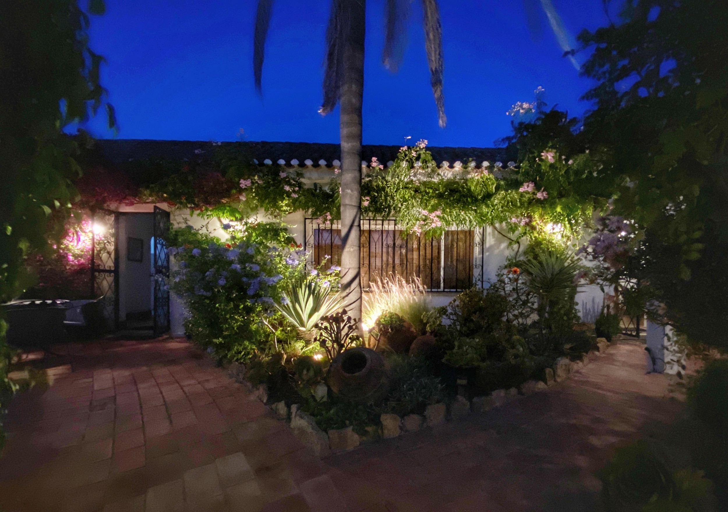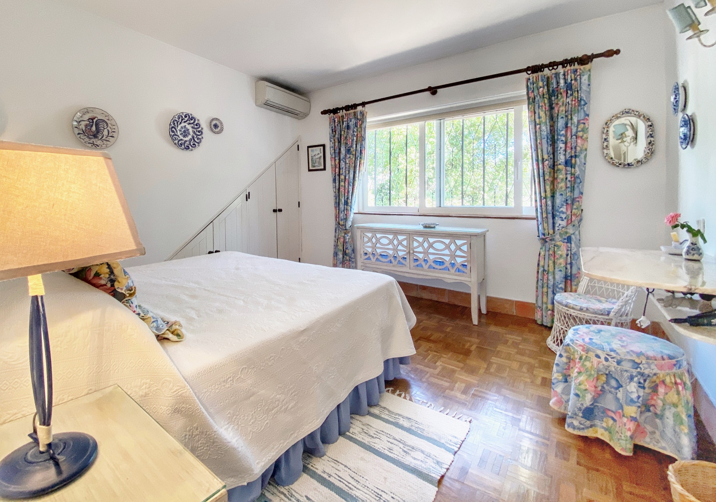 The master bedroom, with its king-sized bed, enjoys spectacular views.  It has its own dressing room and bathroom en suite.  There are two further bedrooms downstairs.  The pink bedroom has two twin beds with recently refurbished en suite bathroom .  The blue bedroom is smaller and can have two small single beds for children or can be made up as a double bed as required – this room uses the third downstairs attractively tiled blue shower room.  There is a further cloakroom.    All bedrooms have the advantage of air conditioning.
