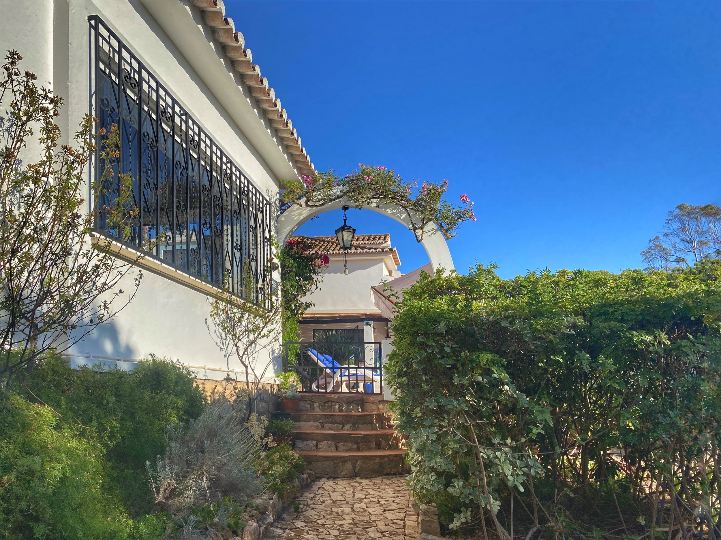 The Villa Colina is situated six miles west of Albufeira close to the famous village of Guia where you may sample the delicious chicken piri-piri from one of its many typical Algarvean restaurants.  The villa is approached through the ‘Pineapple Palm’ entrance leading to the well-known Quinta da Saudade estate.  It must be pointed out that this is open to the public but persons using Casa da Colina are not eligible to use the communal swimming pools unless invited.  On the other hand, the tennis court is available at any time.  The Restaurant, open six days a week during the summer months and serves a good variety of food.  Weekly barbecues are held on a Saturday night in the summer, which are great fun for the family – persons using Casa da Colina Villa will be most welcome but booking is essential.