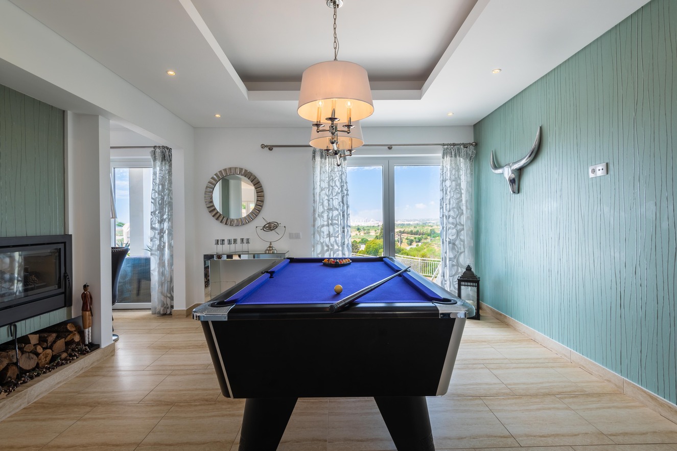 The sitting room is on the ground floor and has views of the pool. There is a fireplace for the cooler months and a room off the sitting room with a full sized pool table.