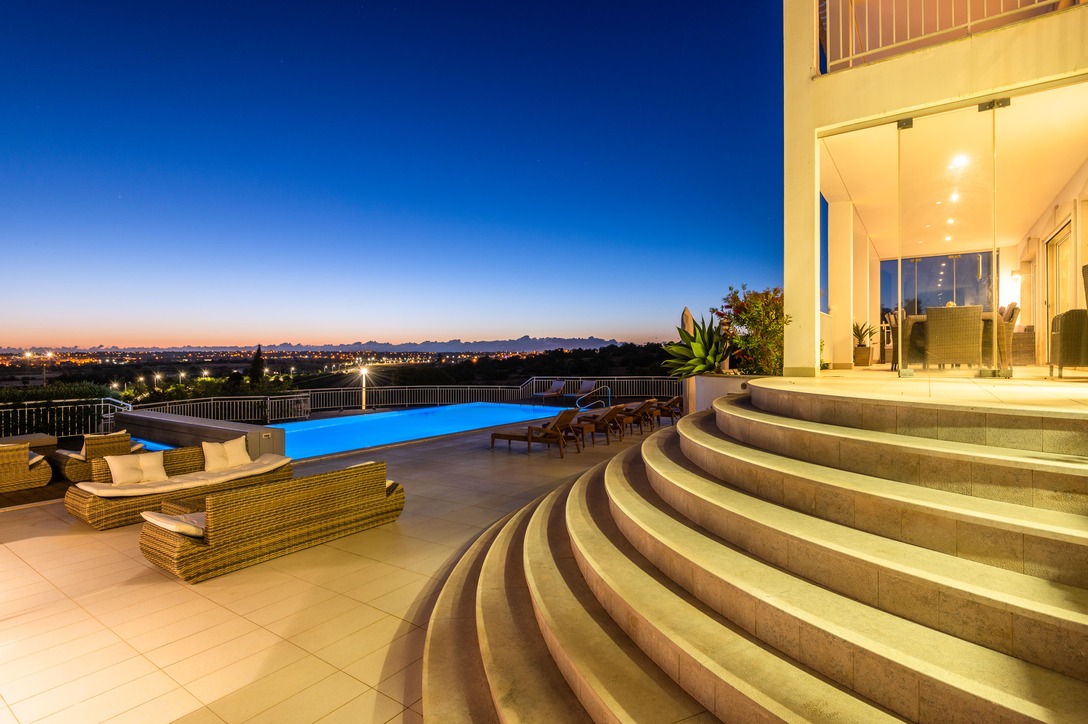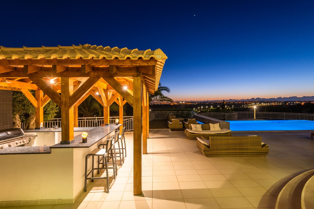 The garden is spacious. The pool measures 6×12 metres and has an automatic hard roller cover. It is heated and lit at night. It is set within a beautiful west facing sunset terrace with views out to the sea. There are ample sun loungers and tables, chairs and sofas