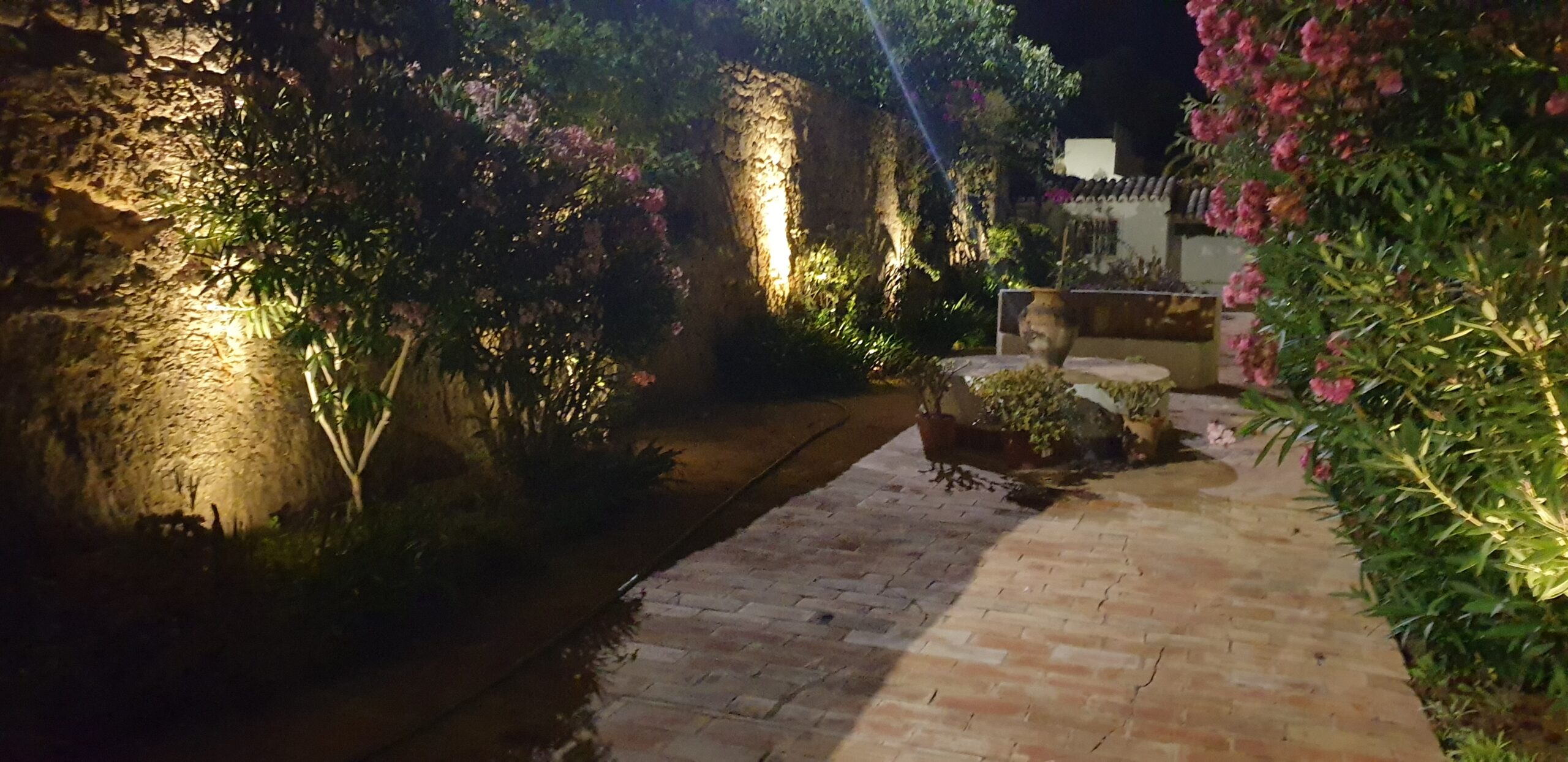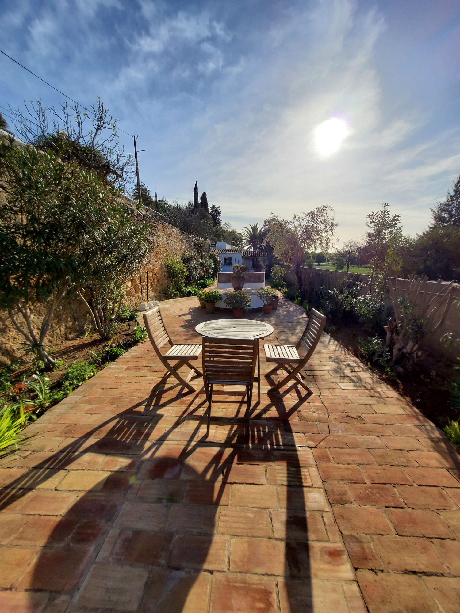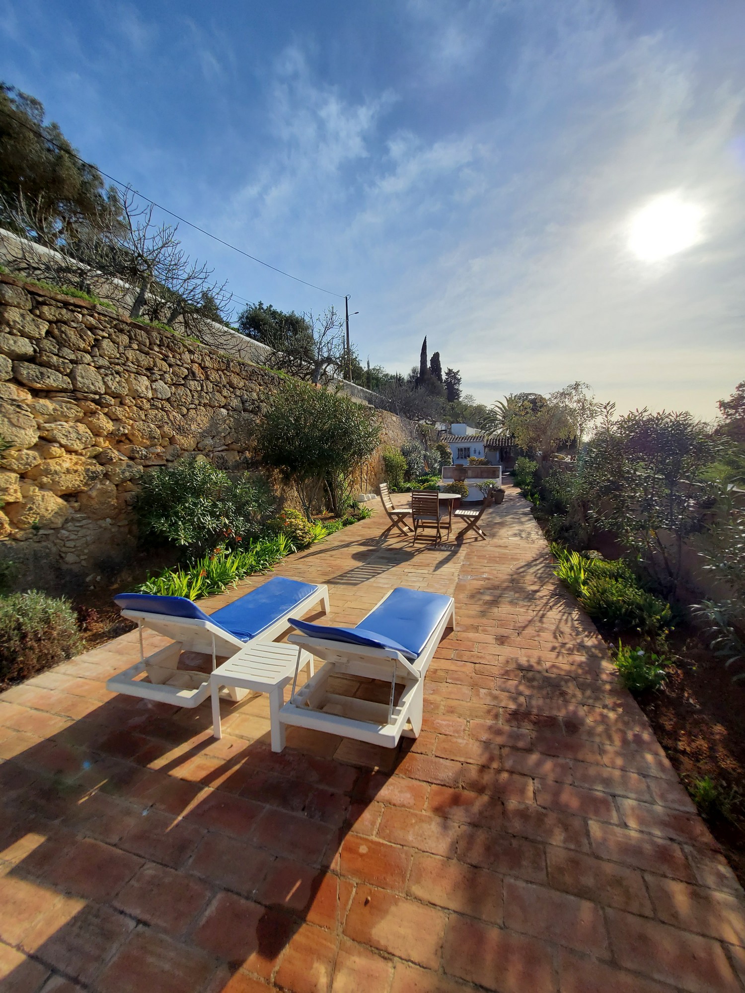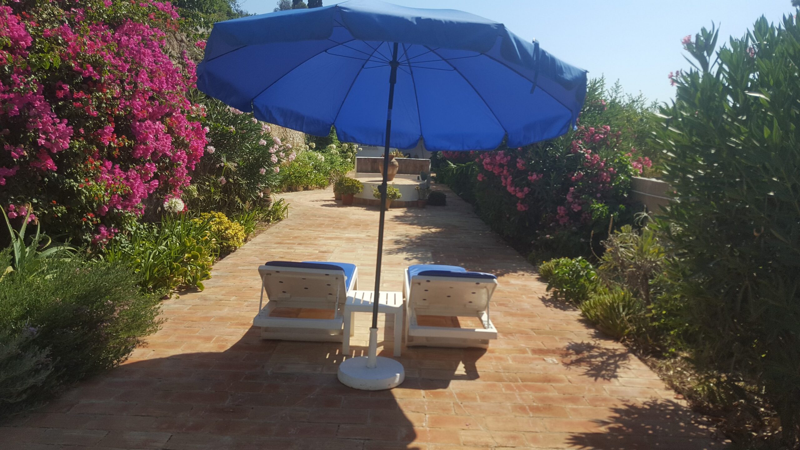 The sitting room has French doors leading out to the fifty metre long garden. There is a large circular tiled table with built-in seating and a good sized built-in barbecue. There are various tables and chairs situated throughout the garden as well as sun loungers and umbrellas. There is a beautiful orchard at the end of the garden full of orange and lemon trees with a hammock under the huge palm tree for relaxing with a cup of coffee or evening cocktail. Also on the top level of the garden are some delicious fig trees. Please help yourselves to the fruit when it is in season.