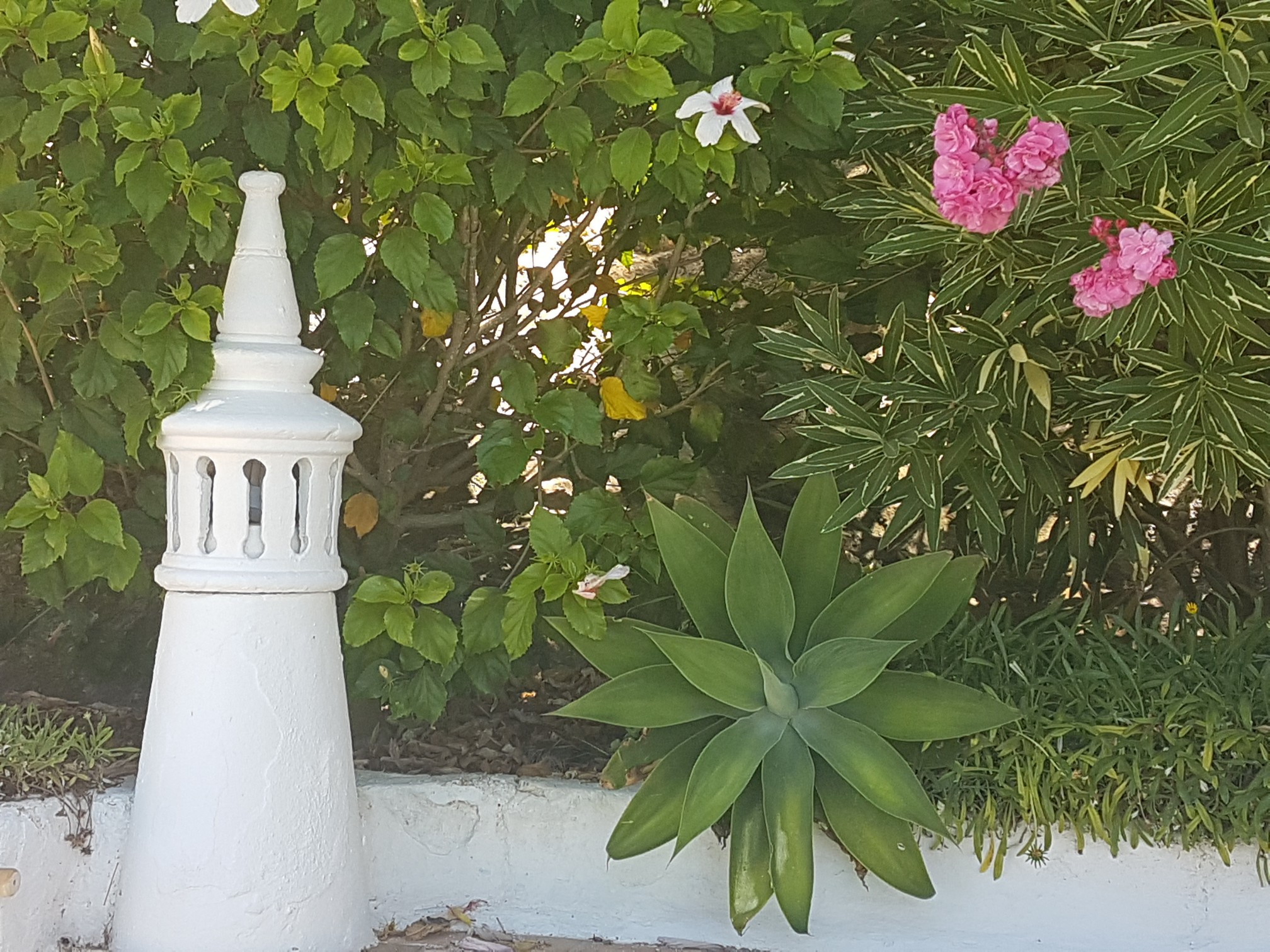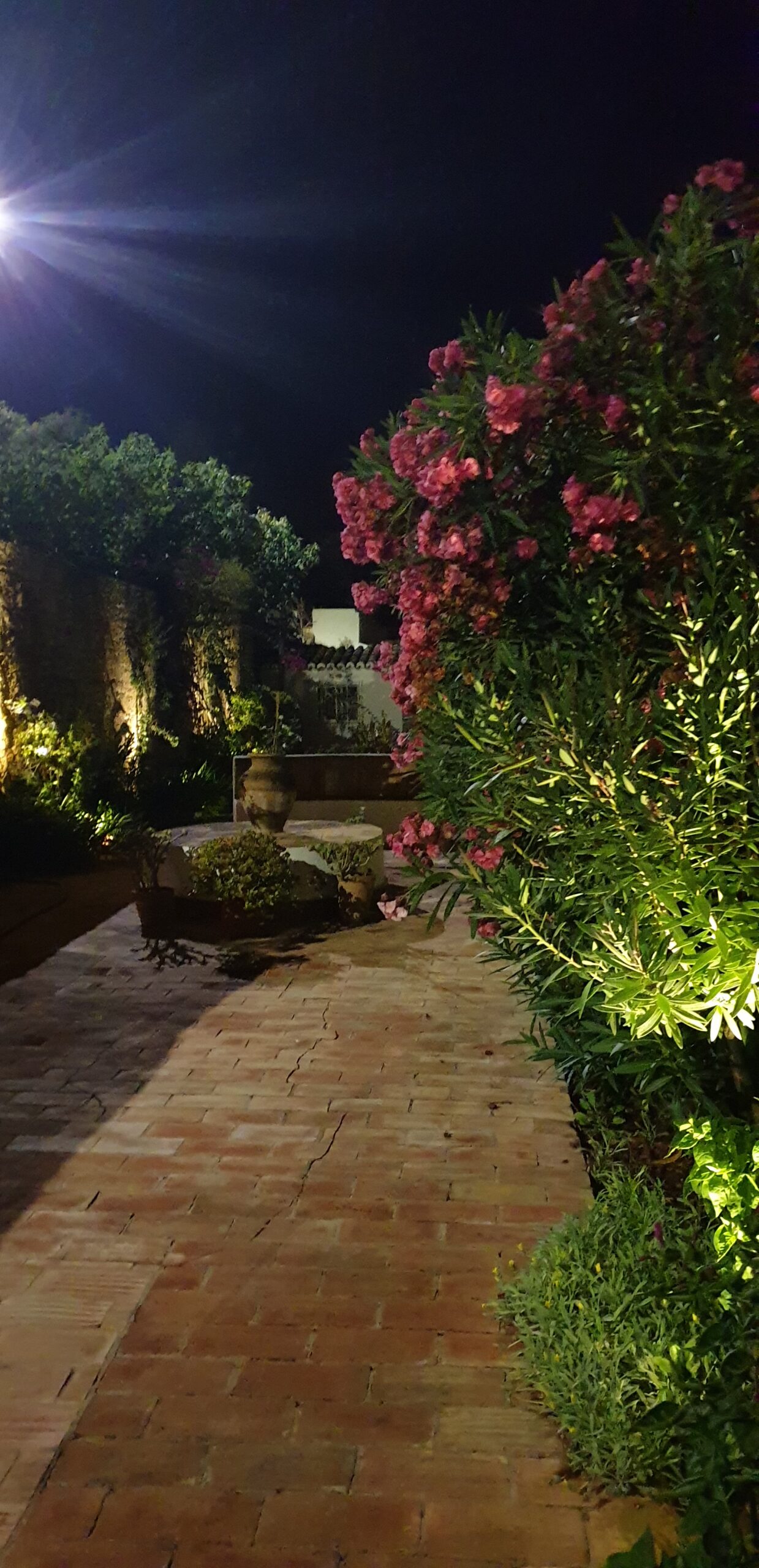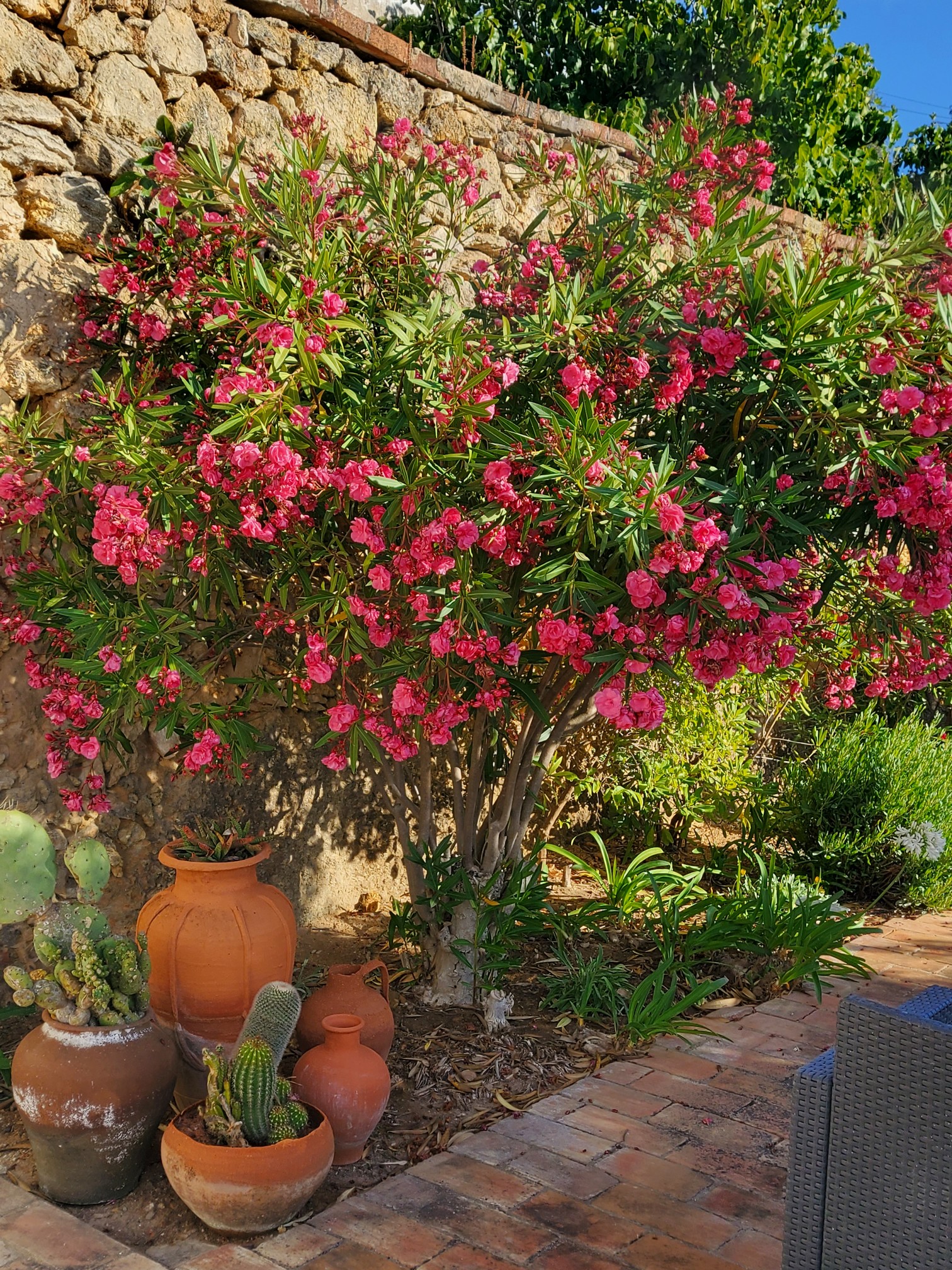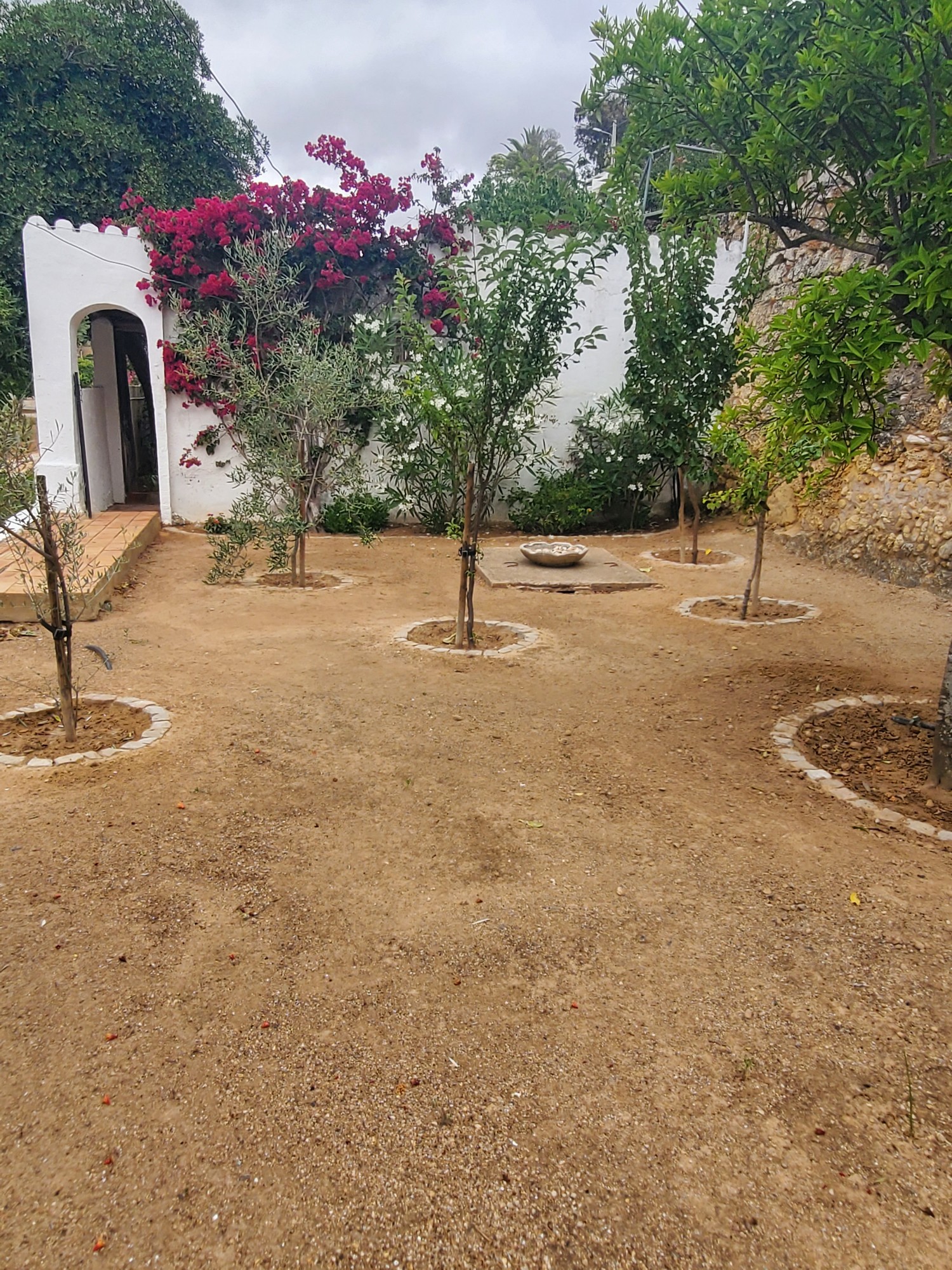 The sitting room has French doors leading out to the fifty metre long garden. There is a large circular tiled table with built-in seating and a good sized built-in barbecue. There are various tables and chairs situated throughout the garden as well as sun loungers and umbrellas. There is a beautiful orchard at the end of the garden full of orange and lemon trees with a hammock under the huge palm tree for relaxing with a cup of coffee or evening cocktail. Also on the top level of the garden are some delicious fig trees. Please help yourselves to the fruit when it is in season.