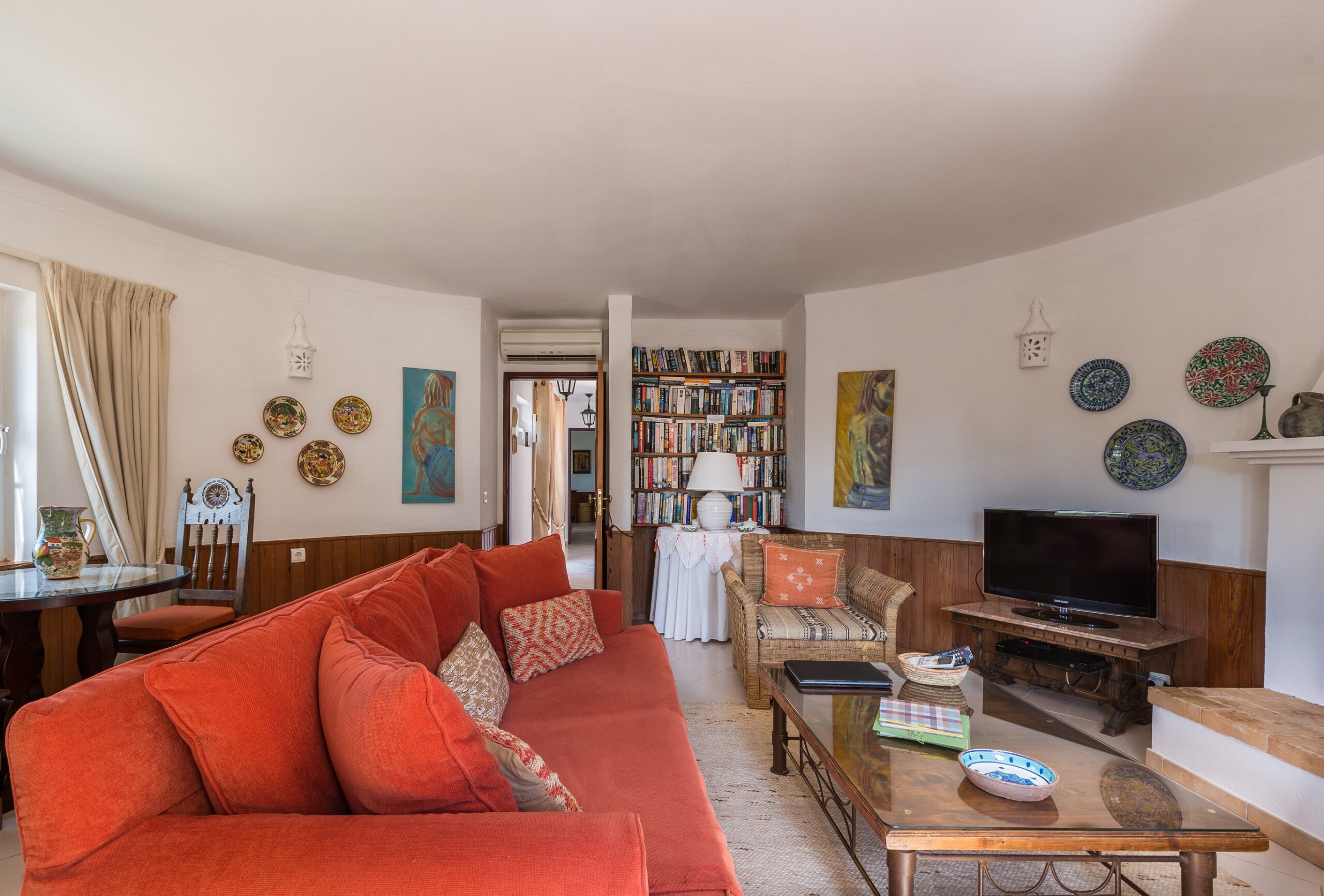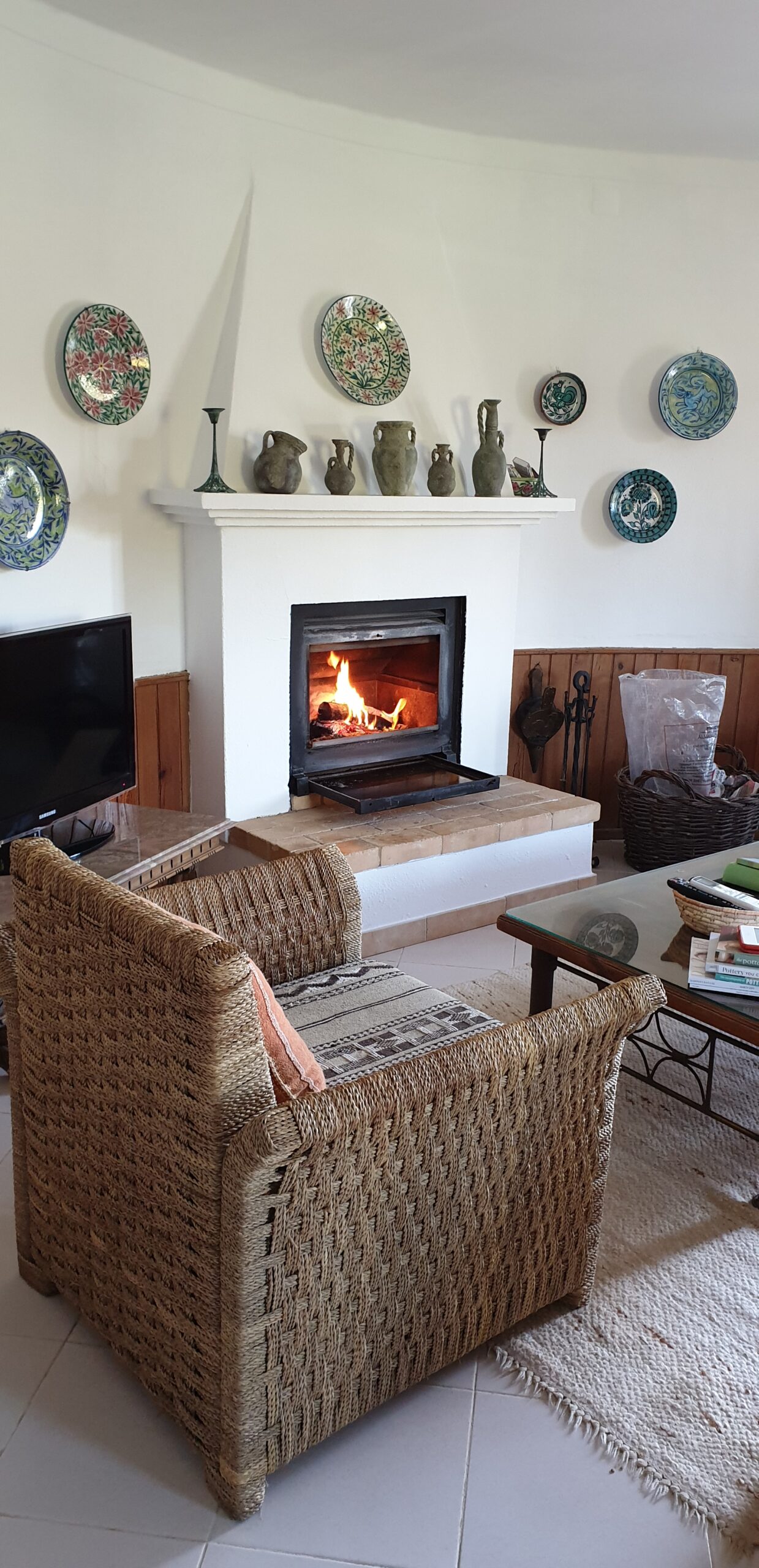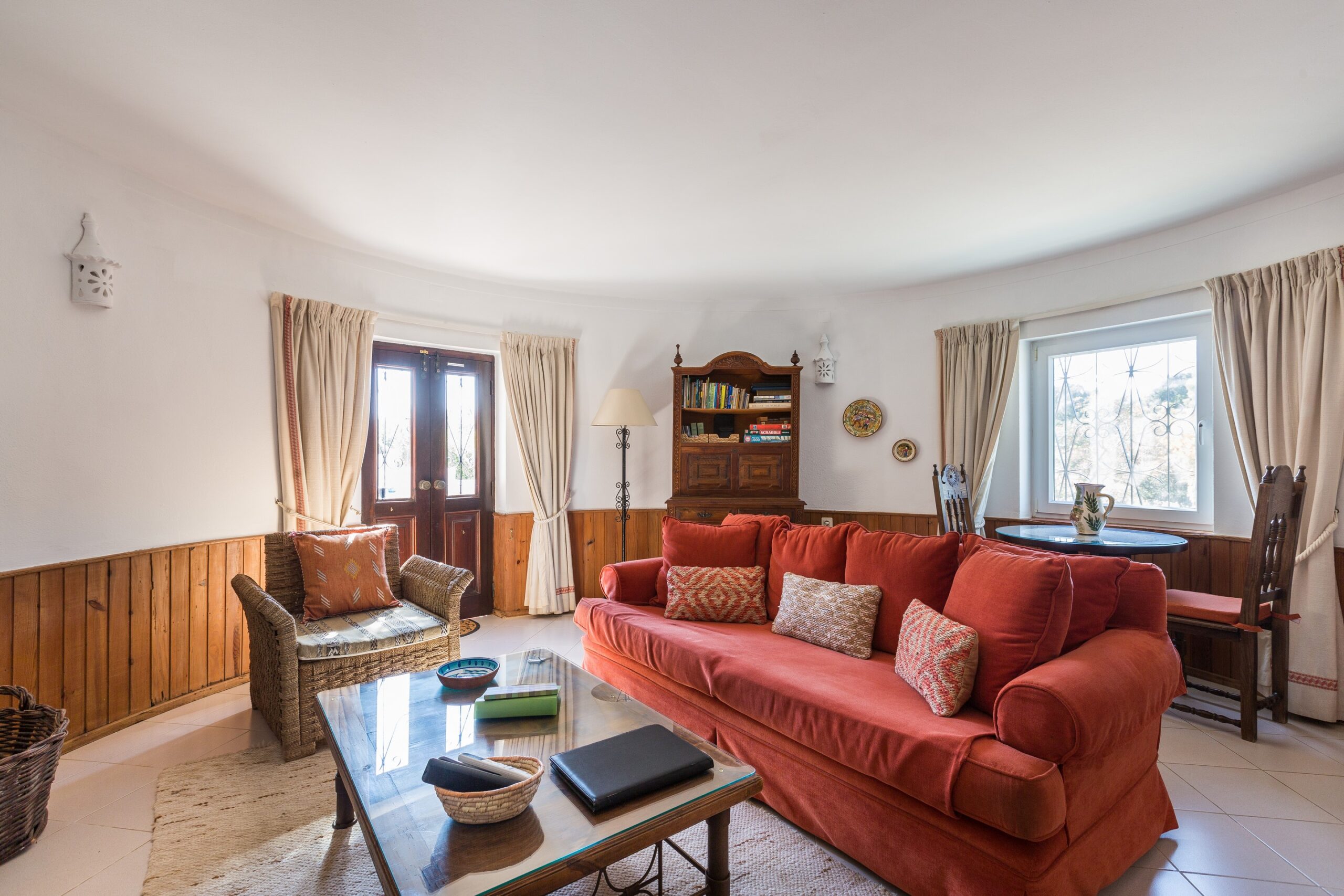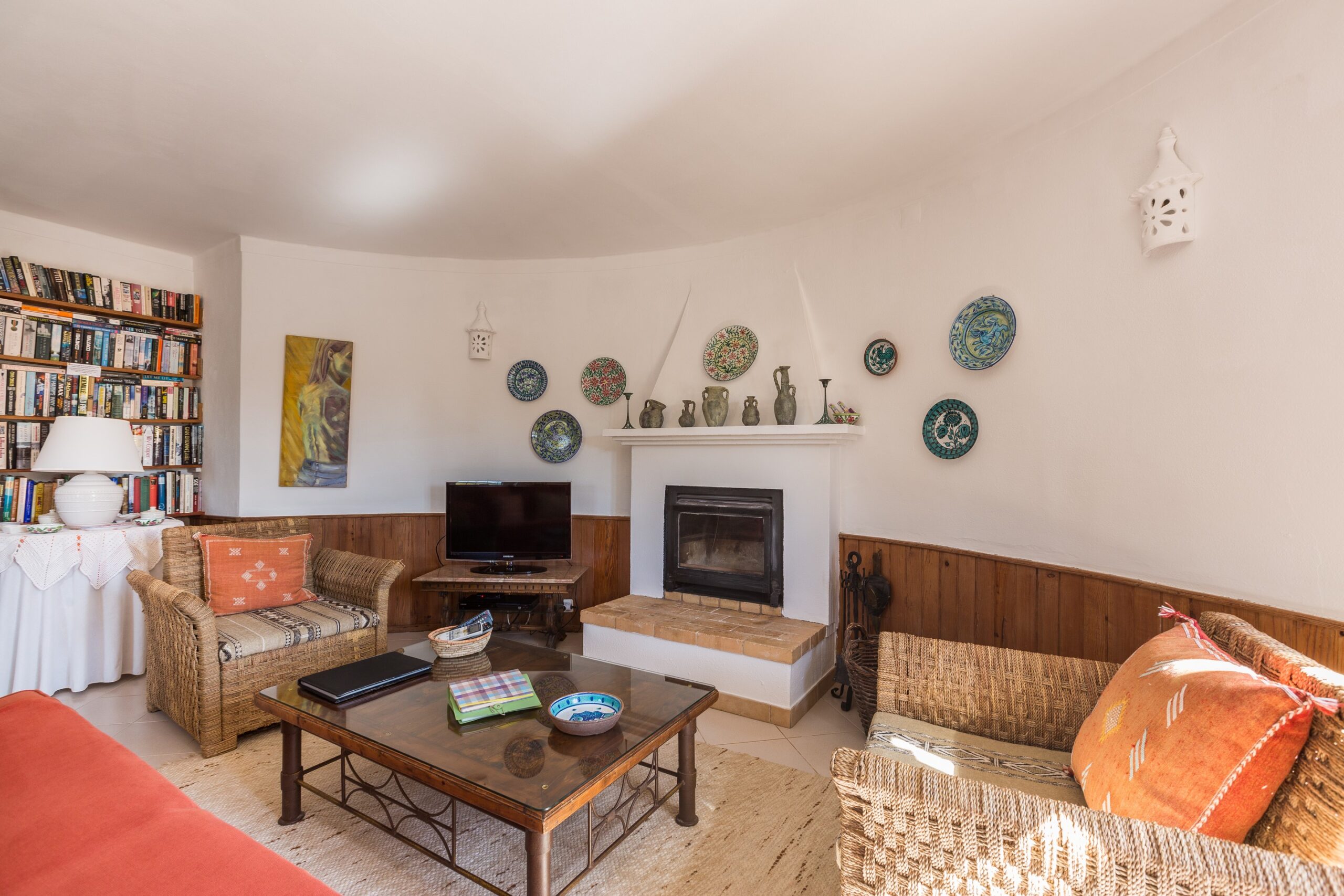 The large and circular sitting-room has a television receiving English, Portuguese and other satellite channels, a DVD player and a digital radio. For Winter occupation, there is a good stove/open fire. There is a large comfortable sofa and chairs and a table for dinner which is perfect for having cosy dinners in front of the during the winter evenings. There is a library with books to suit all tastes and a good selection of board games and music DVDs.
