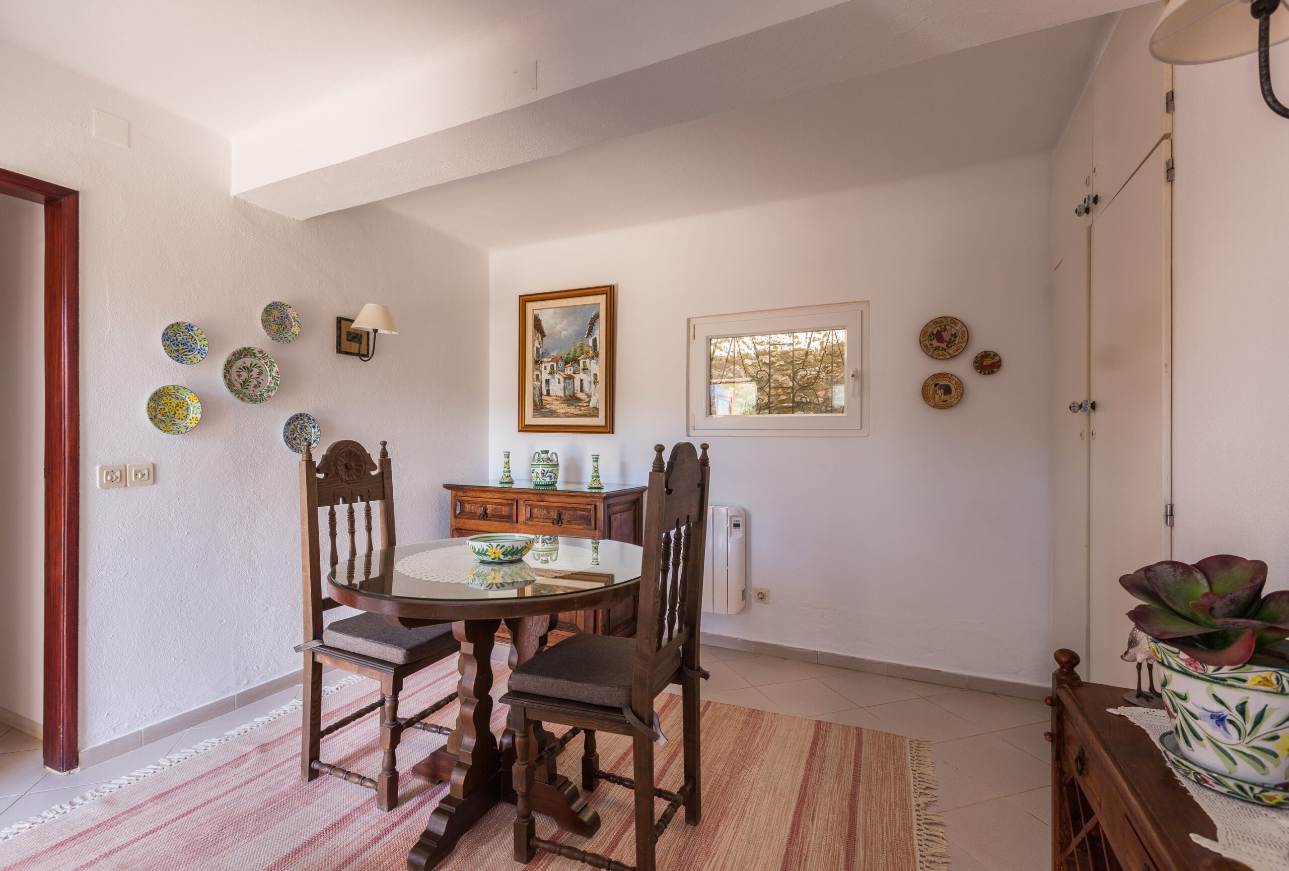 It has an entrance hall/dining-room, a good-size sitting room, a twin bedroom and a newly renovated en-suite bathroom with walk in shower, WC, sink with storage, electric towel rail and wall heater. The bathroom looks out onto the newly planted olive trees.