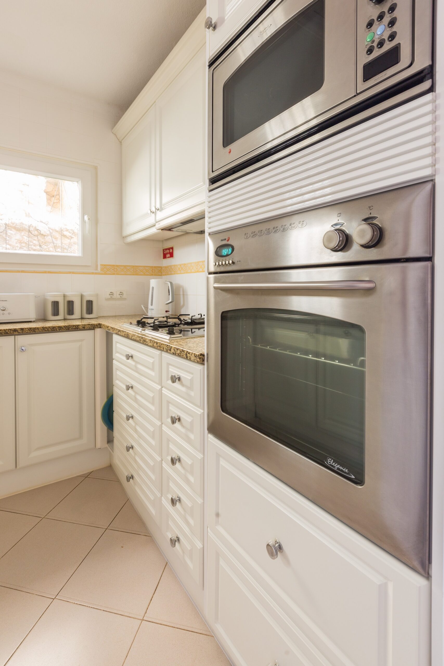 The kitchen has a washing machine, dishwasher, fridge/freezer, double sink, microwave oven, electric oven with eye level grill, and an electric hob. It is very well equipped.